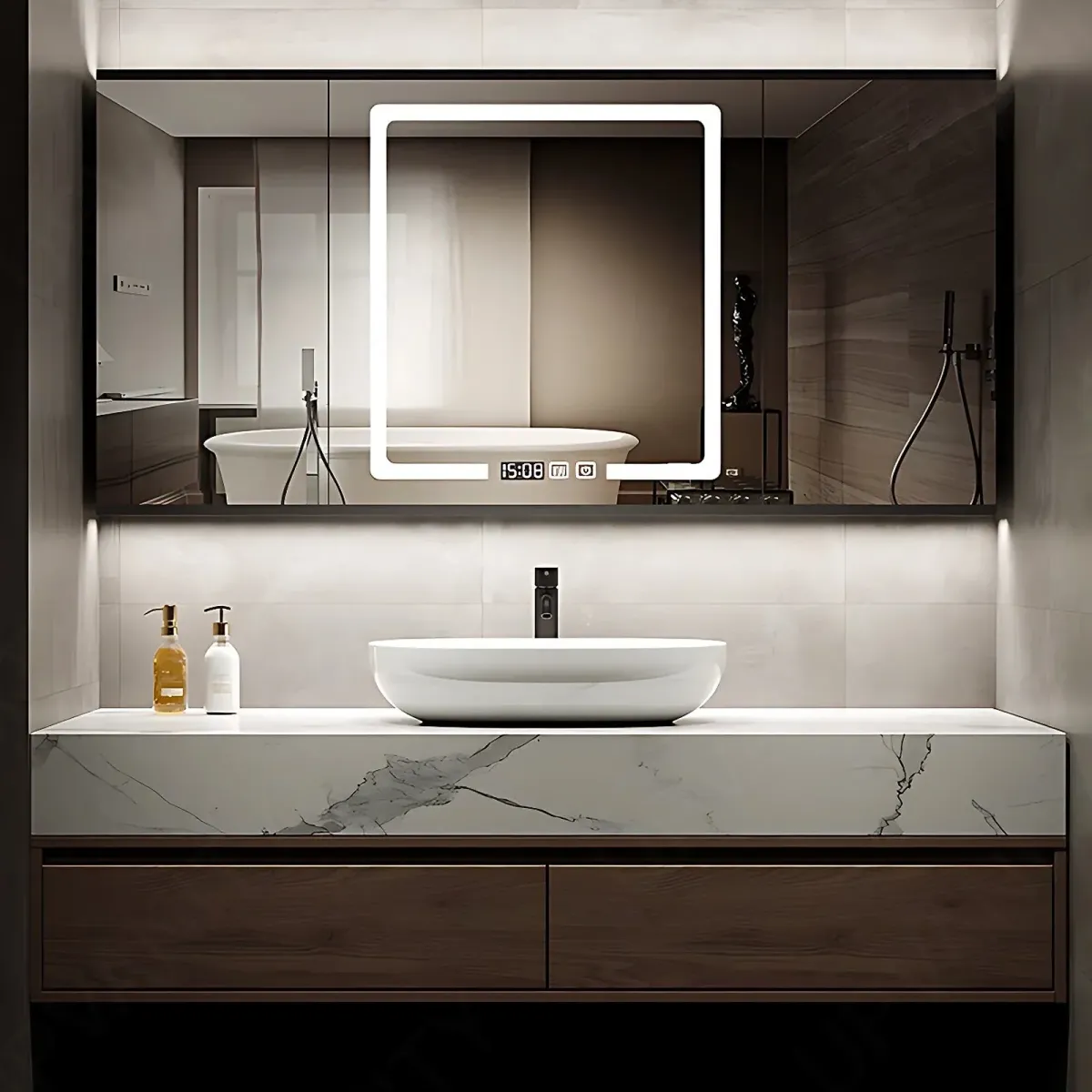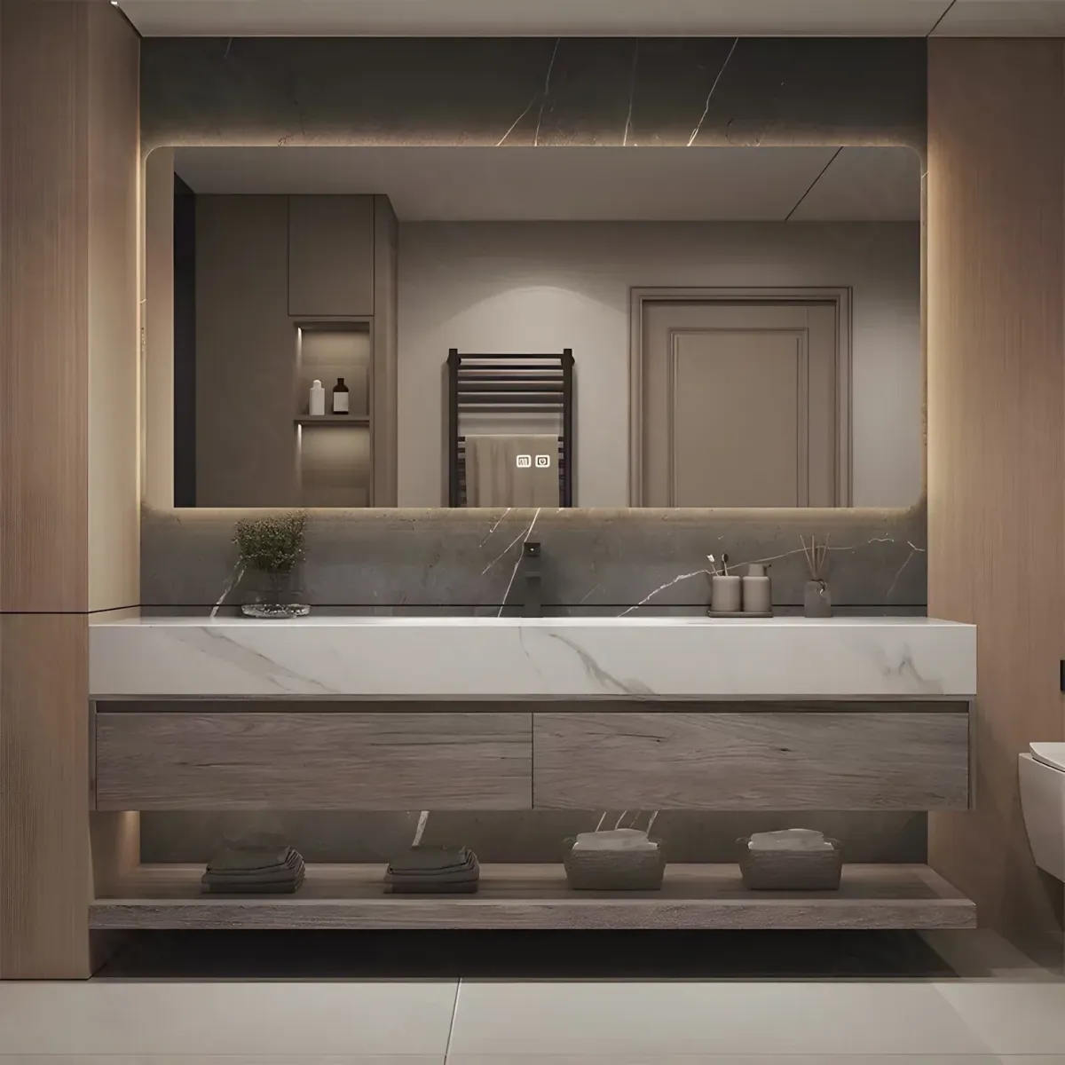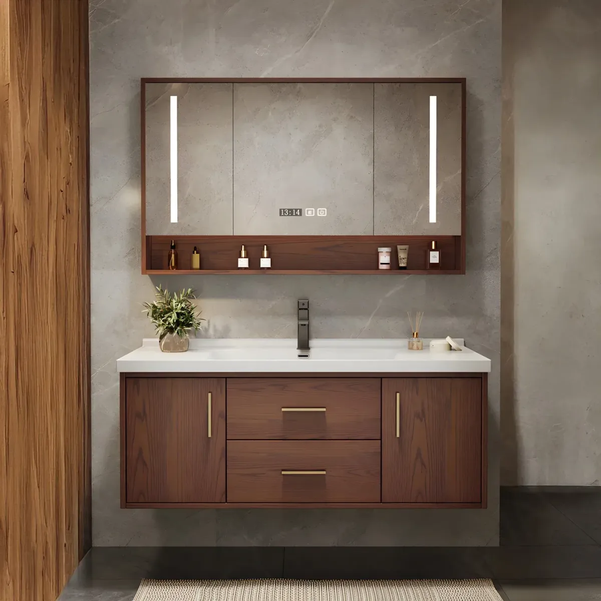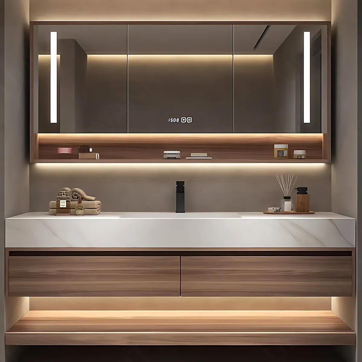 Modern Bath Vanity Set, Brown, White Slate Top, 32"-72", Single, Floating, Classic Panel, Smart LED Mirror