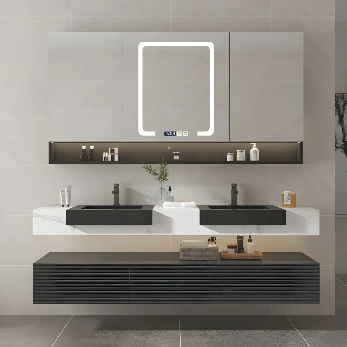 Elegant Bath Vanity Set, Black, Split White Top, 32"-68", Single/Double, Floating, Open Storage, Smart LED Mirror, Rear Cabinet