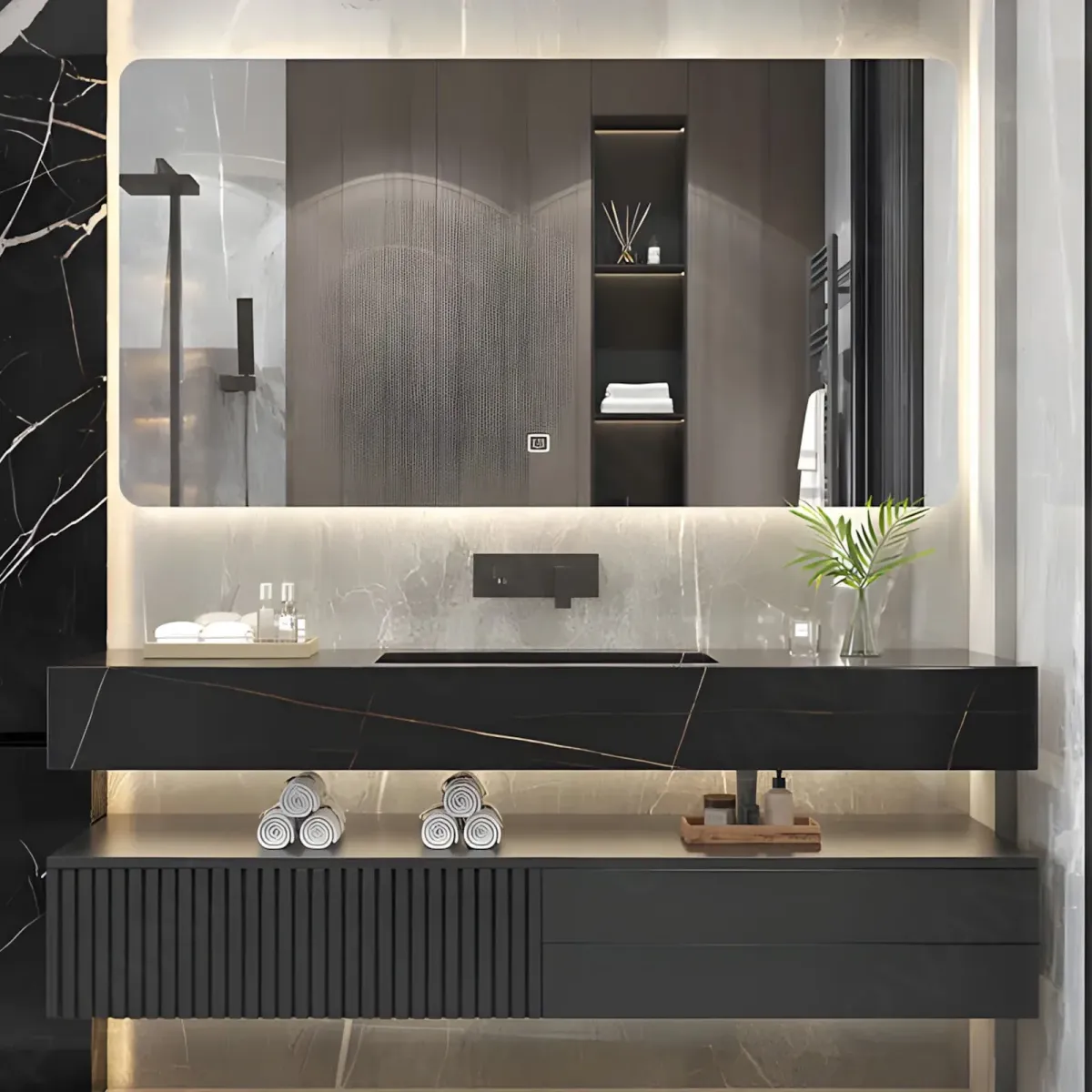 Modern Bath Vanity Set, Black, White Slate Top, Classic Panel, 40"-64", Single, Floating, Smart LED Mirror, Rear Cabinet