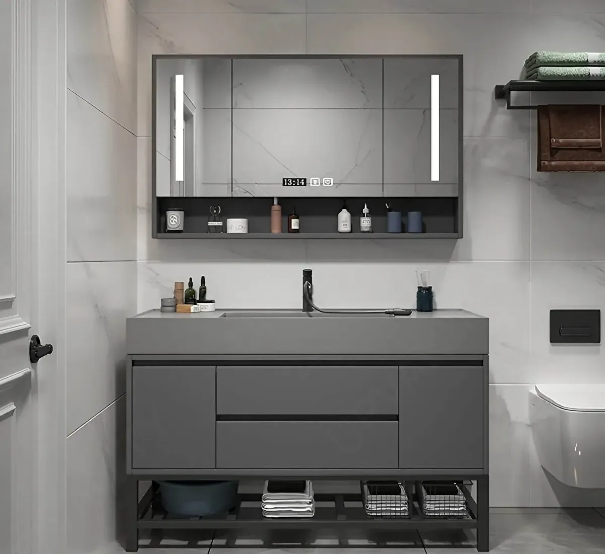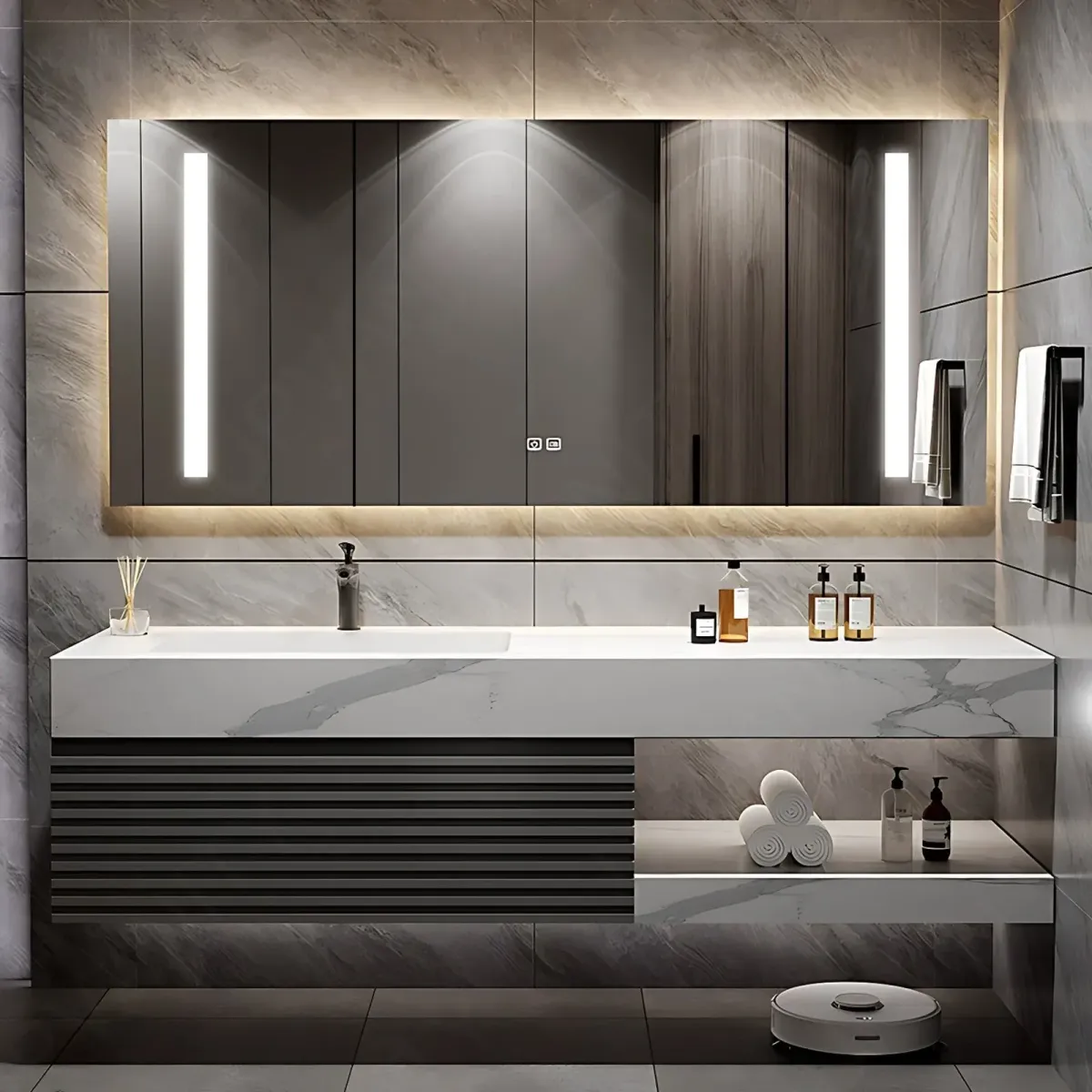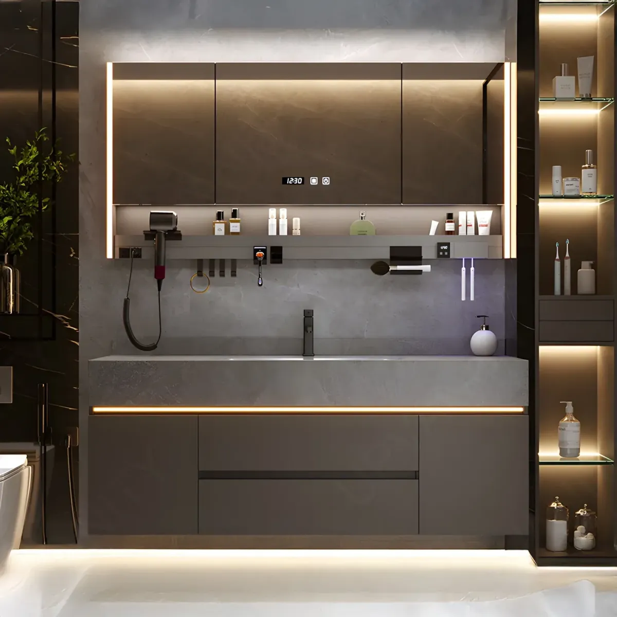 Modern Bath Vanity Set, Gray, Joint Slate Top, 36"-76", Single, Floating, Open Storage, Smart LED Mirror