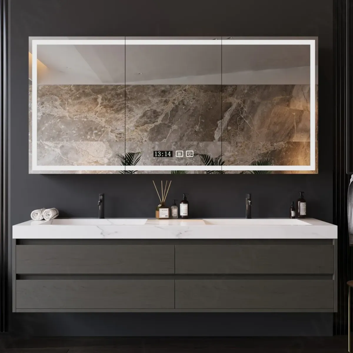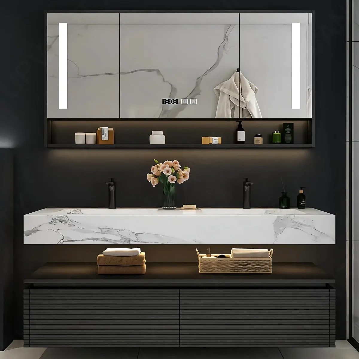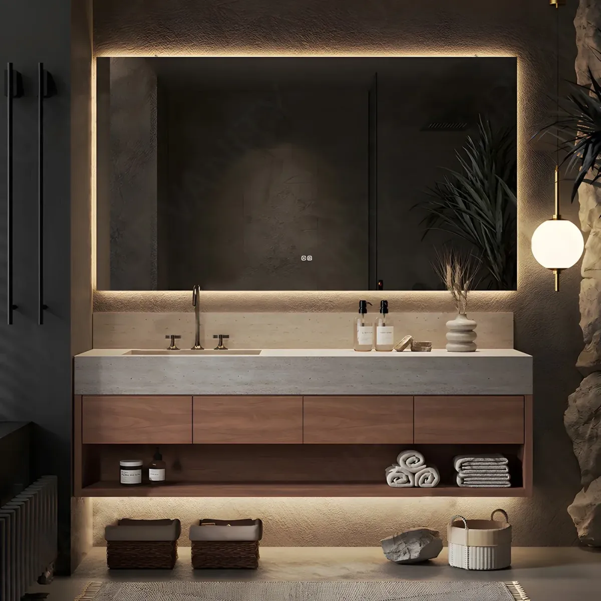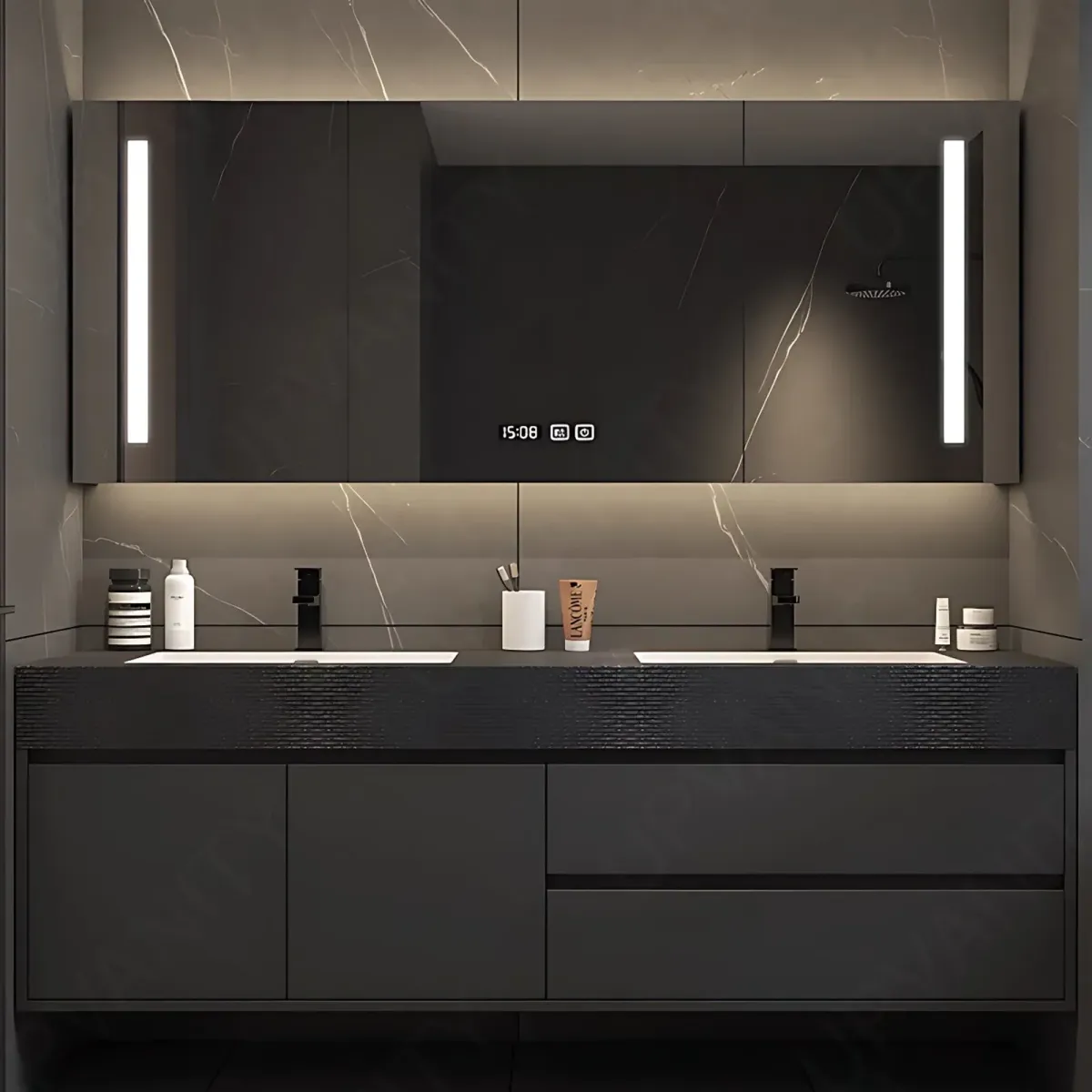 Modern Bath Vanity Set, Gray, Joint Slate Top, 36"-76", Single, Floating, Open Storage, Smart LED Mirror