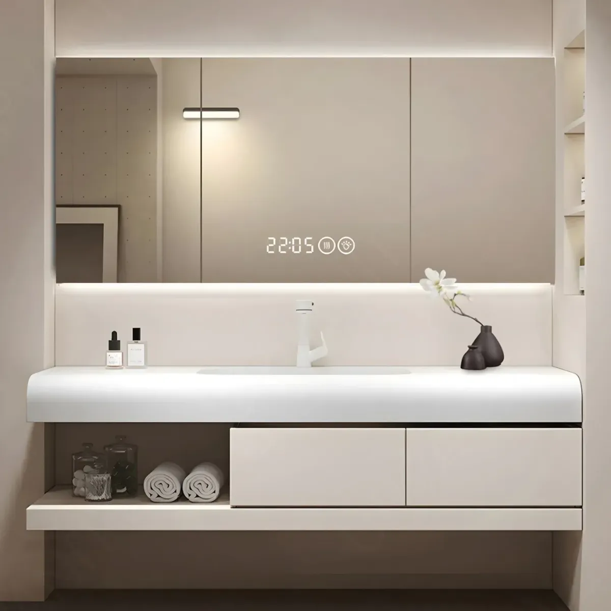 Modern Bath Vanity Set, Beige, Joint White Top, 40"-48", Single, Floating, Smart LED Mirror, Rear Cabinet