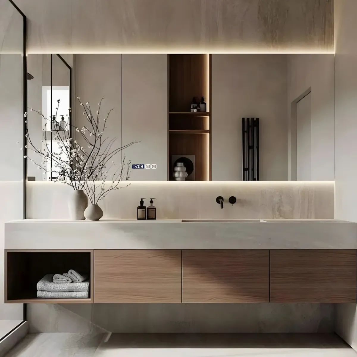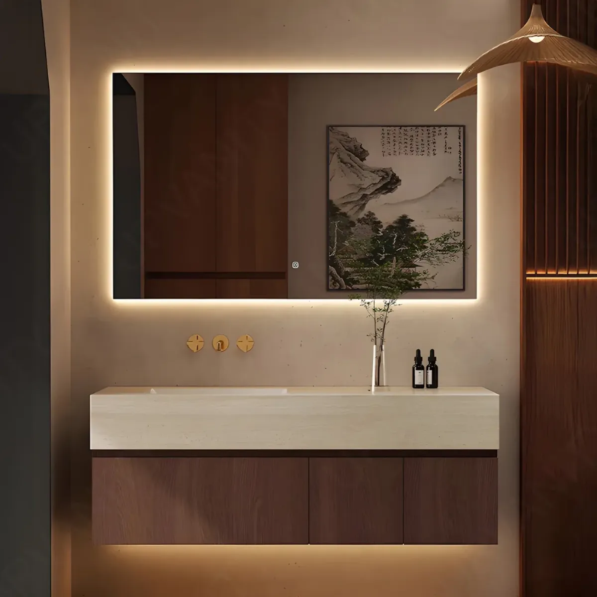 Modern Bath Vanity Set, Natural, Beige Slate Top, 40"-64", Single, Floating, Open Storage, Smart LED Mirror, Rear Cabinet