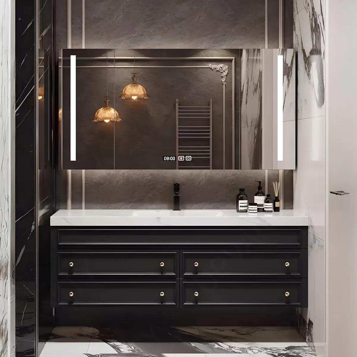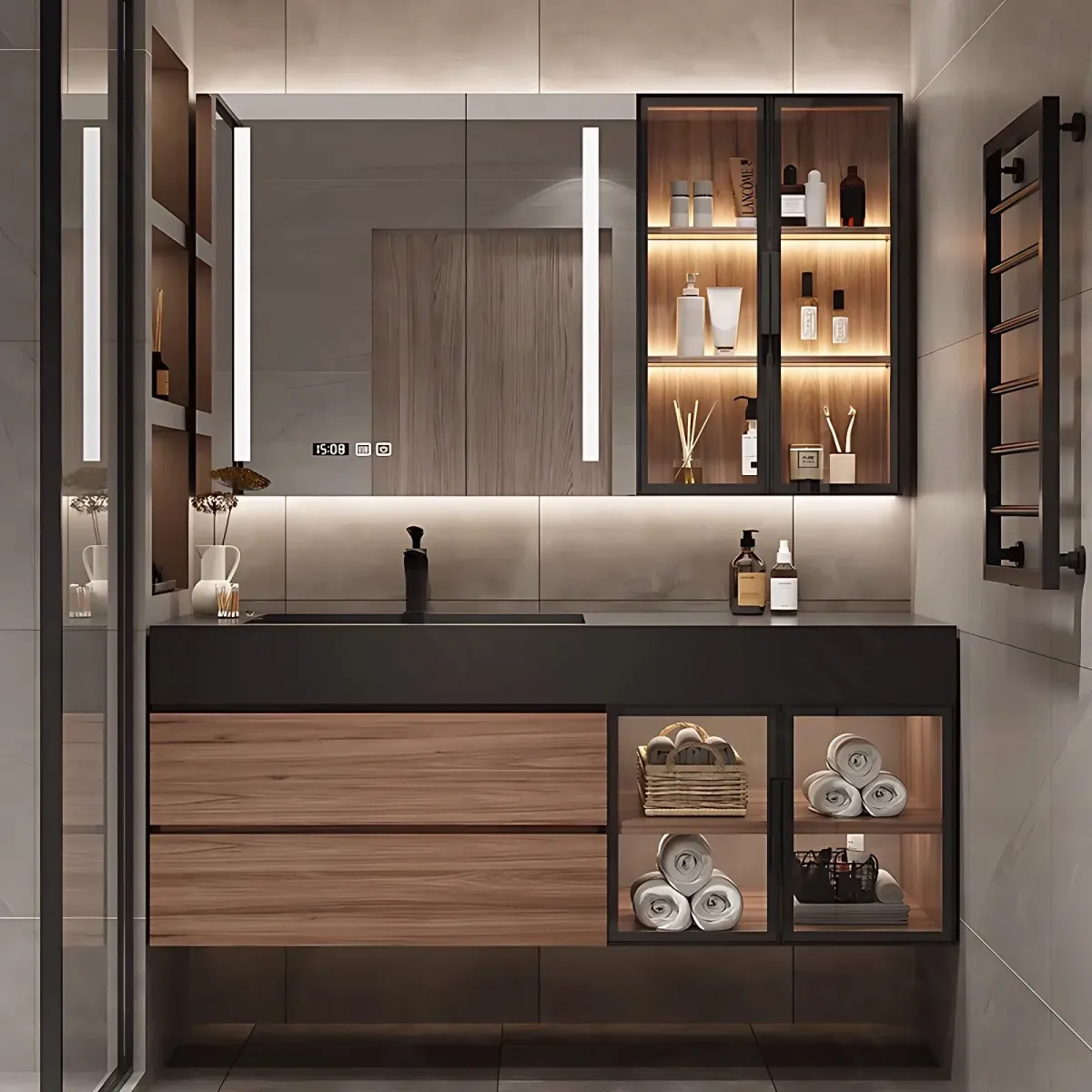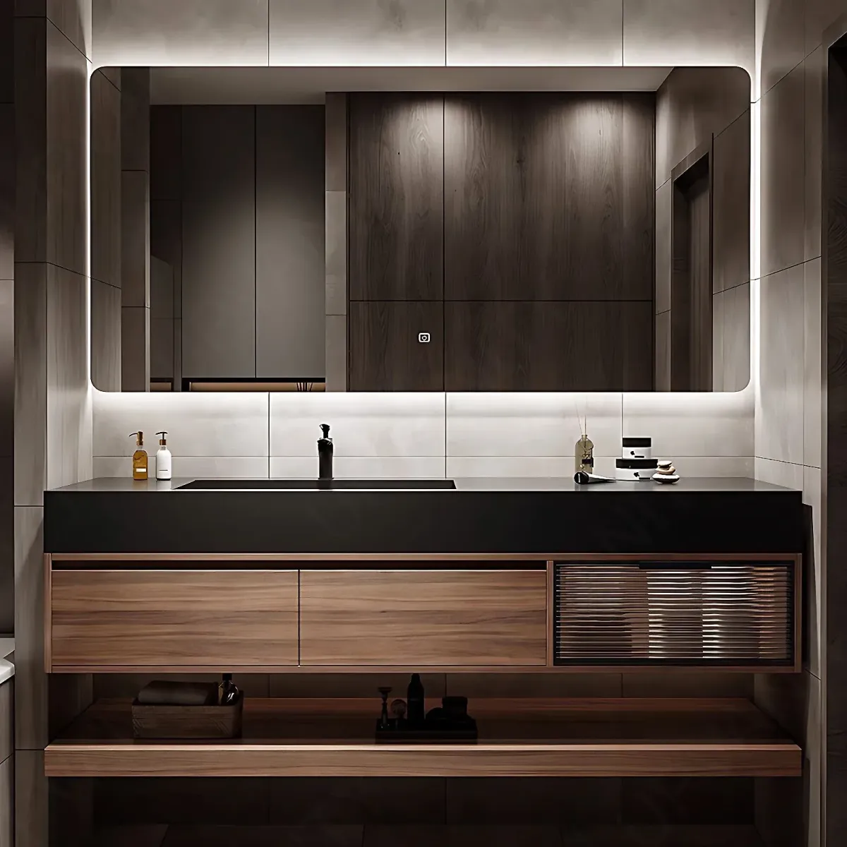 Modern Bath Vanity Set, Brown, Joint Black Top, Glass Door, 48"- 64", Single, Floating, Smart LED Mirror