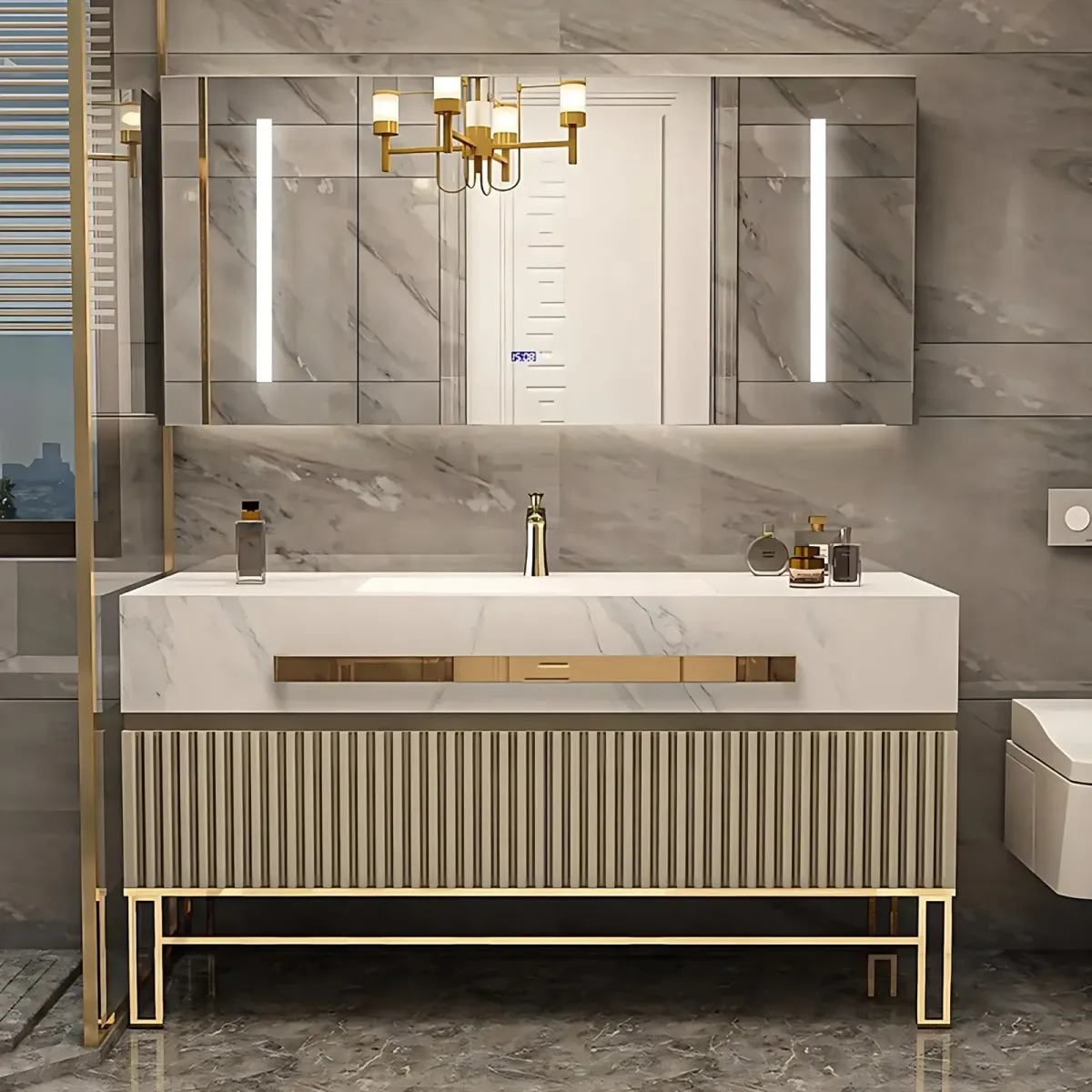 Luxury Bath Vanity Set, Gold, Striped Panel, 36"- 48", Single, Freestanding, Smart LED Mirror, Rear Cabinet