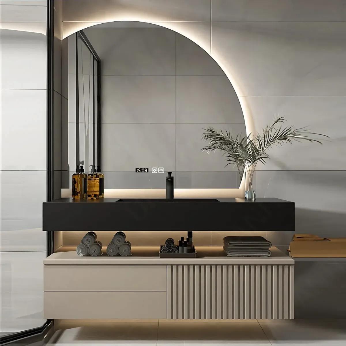 Modern Bath Vanity Set, Beige, Split Black Top, 36"- 60", Single, Floating, Striped Panel, Irregular Smart LED Mirror