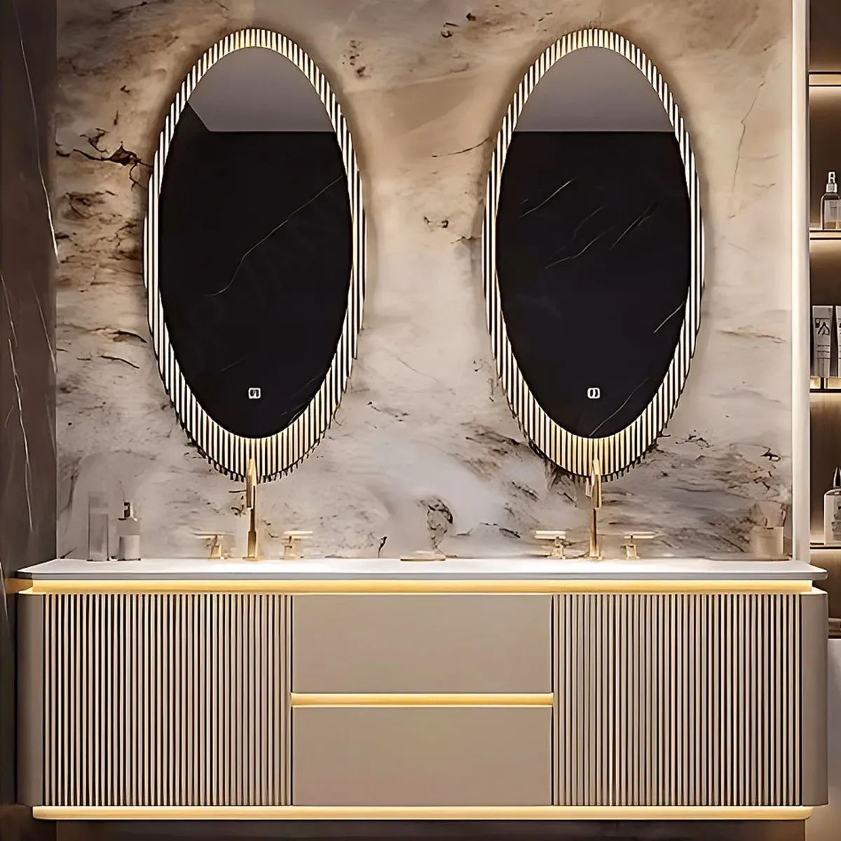 Luxury Bath Vanity Set, Gold, Striped Panel, White Slate Top, 52"- 78", Double, Floating, Sensor Light, Oval Smart LED Mirror