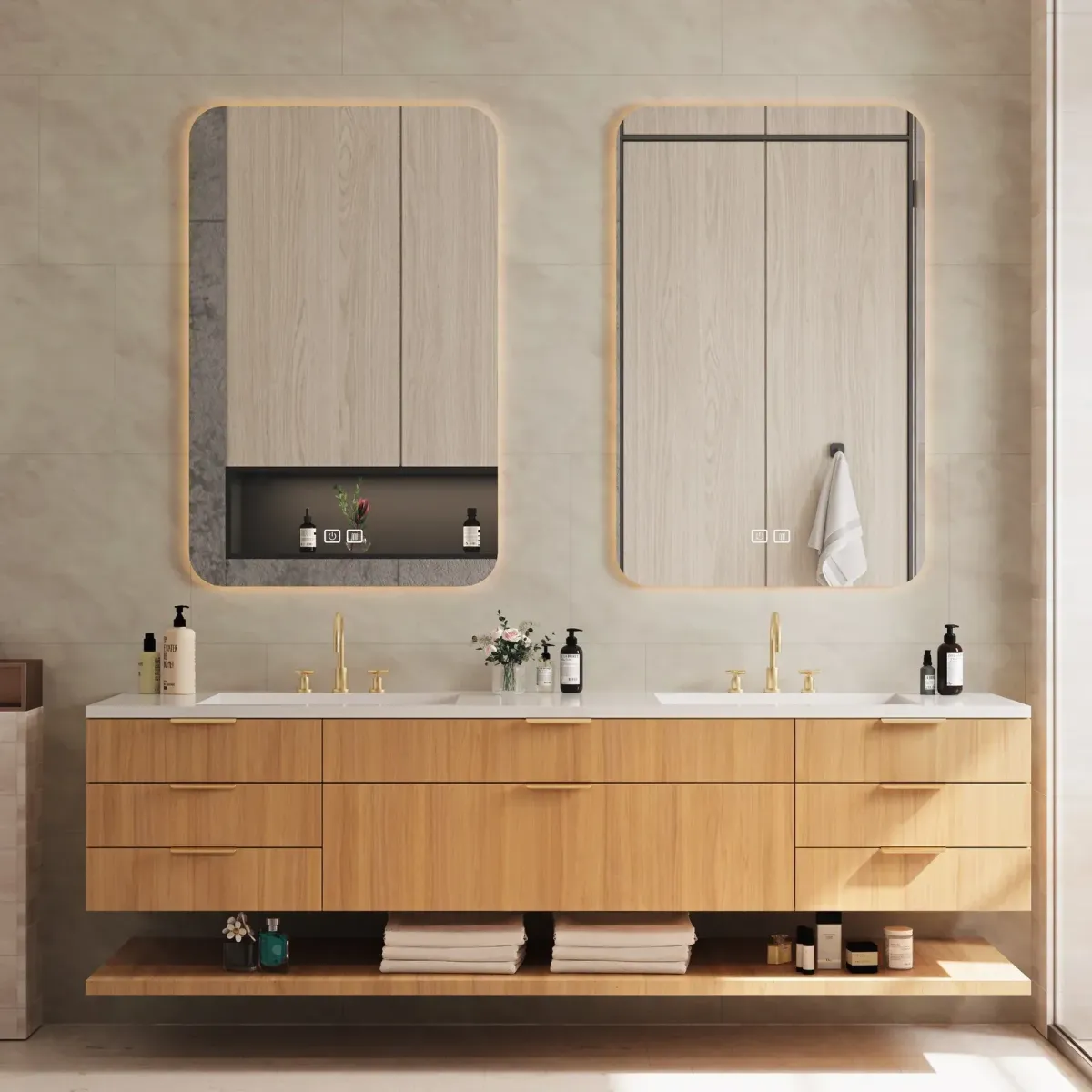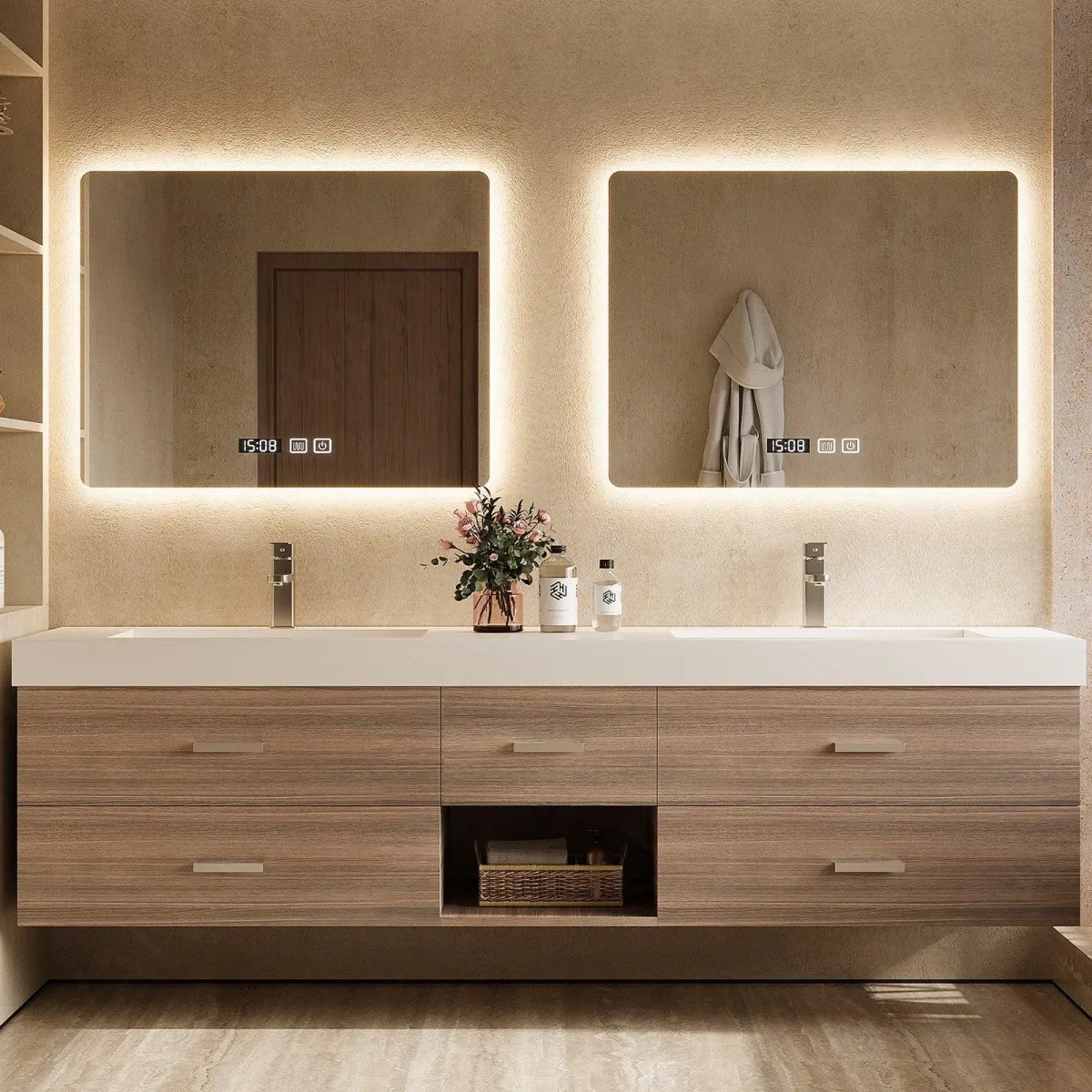 Elegant Bath Vanity Set, Brown, Warm Walnut, 56"- 78", Double, Floating, Dual Smart LED Mirror