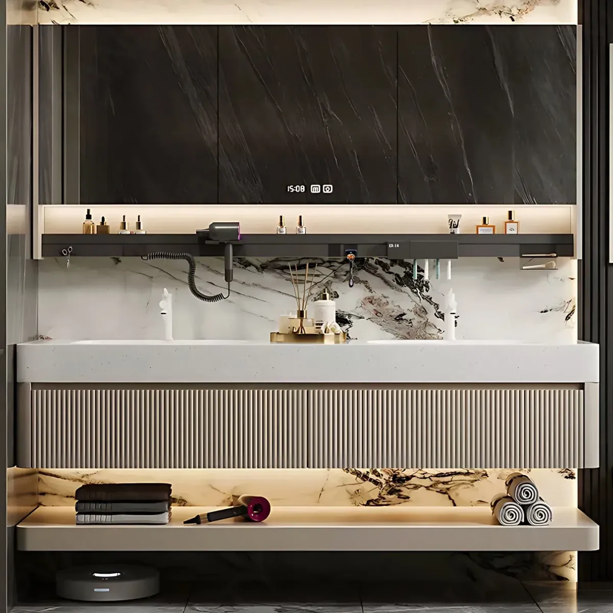 Modern Bath Vanity Set, Beige, Striped Panels, 36"- 78", Double, Floating, Smart LED Mirror, Rear Cabinet, Storage Rack